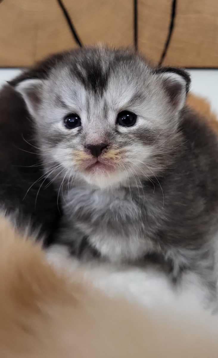 Unser Maine Coon Kitten Snowbell ist mal wieder eins der Mädel, die ich gerne behalten würde! Sie ist typvoll, trotzdem niedlich mit einem jetzt schon unverwechselbaren Ausdruck! Sie ist so groß wie ihre Brüder und tappst schon ziemlich neugierig durch die Welt. Ich bin gespannt, wie sich das Fräulein in den nächsten Wochen entwickelt!